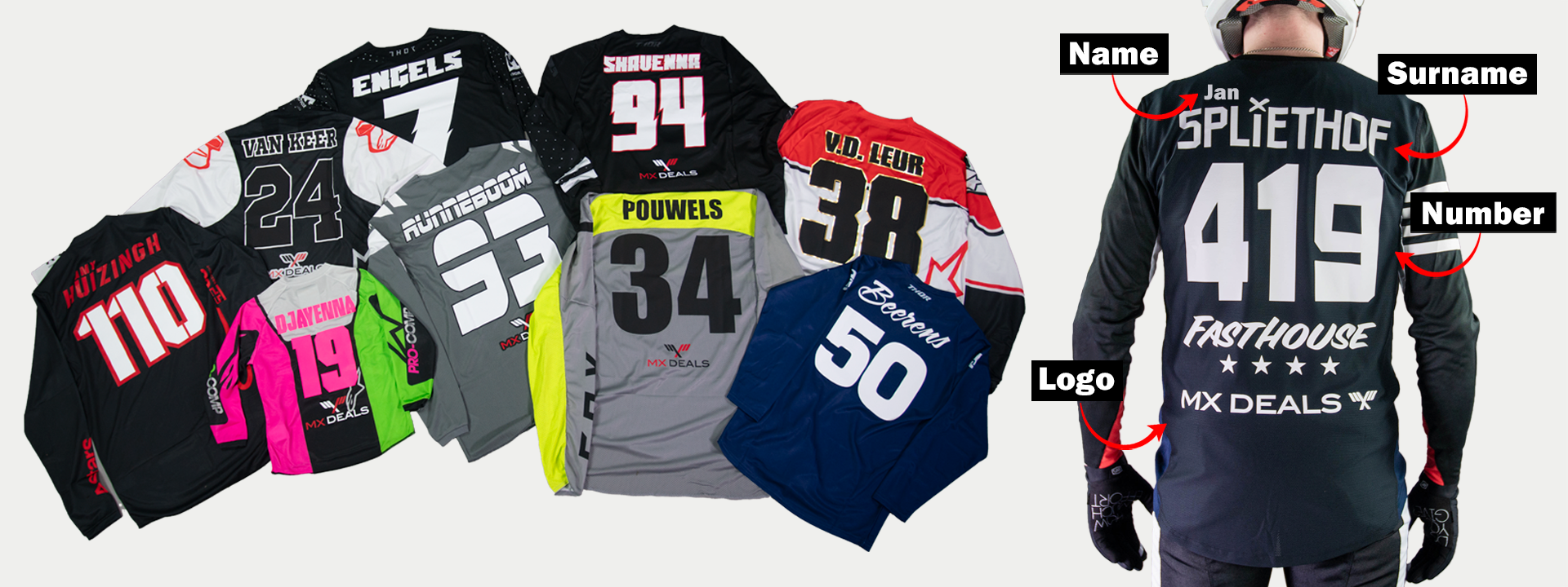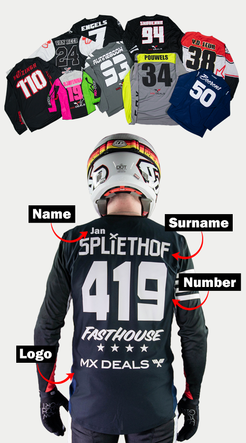 On the product page, you can add your name and race number. Choose the text, style, colour, and placement. You can also include our MX-Deals logo.